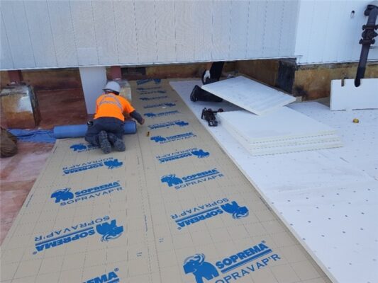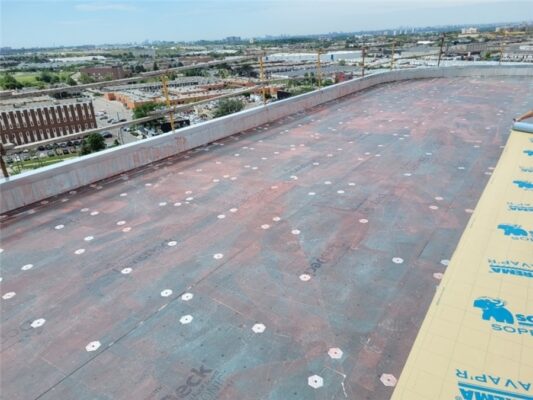 Our recent project involved a complete overhaul of an office flat roof upgrade for a 10-story office in North York. In collaboration with a top-tier roof consulting firm, we custom-designed a state-of-the-art roofing solution that addressed both current and future needs. The building’s original roofing, an outdated ballasted EPDM system, was clearly in need of an update. We undertook a significant upgrade to modernize the entire structure, focusing on the main building with its concrete roof deck and the adjacent mechanical room with a metal deck. To kick off the renovation, we installed Soprema’s SopraVapr vapor barrier along with two layers of polyiso insulation, adhered using Sopremaās innovative Duotack low-rise foam.
