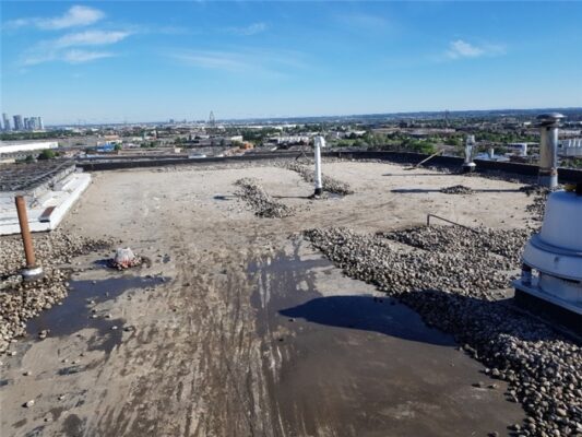 This setup was crucial for enhancing the buildingās insulation and energy efficiency. Additionally, we focused on improving the roof’s drainageāa vital aspect of maintaining the integrity of such a large structure. Then we installed extensive 16-foot poly-iso drain sumps and integrated custom tapered insulation around all the roof drains. This ensures efficient water management and water pooling prevention. This flat roof replacement project was completed with the addition of an asphaltic cover board and two plies of Sopremaās SBS-modified bitumen membrane, torch-adhered for maximum durability and resistance to harsh weather. We also fitted new custom sheet metal flashings to protect and enhance the roof edges. If your property requires a durable and professionally installed roof, contact Industrial Roofing today.