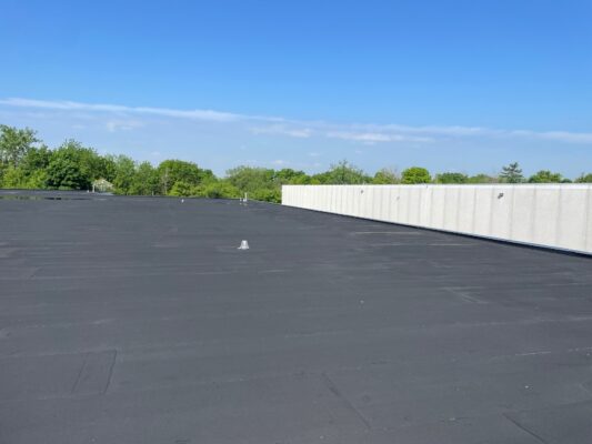 On the lower roof, we installed back slope insulation around the perimeter to enhance drainage towards the sumped roof drains. Additionally, we added two extra drains on the upper roof level to address areas that previously retained water. A new 2-ply modified bitumen SBS membrane was installed, featuring a black granule cap sheet as per the client’s request. We finished the project with custom black sheet metal flashings on all roof levels for an upgraded appearance. Contact us today to find out if your building is a candidate for a flat roof membrane peel in Vaughan!