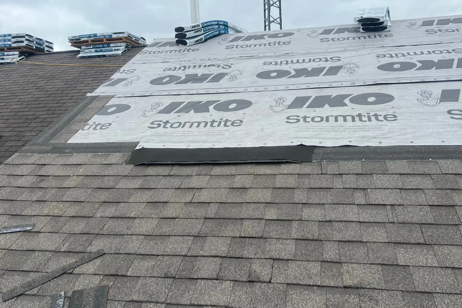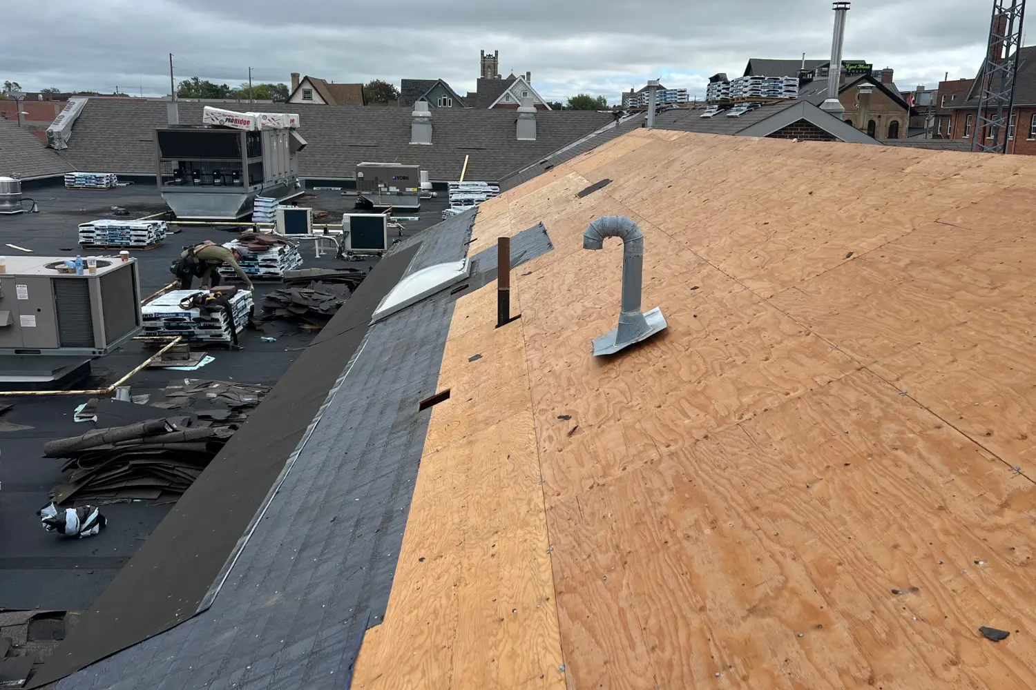 Because the sloped roof sits above an active flat roofing system, special precautions were taken to ensure no water infiltration occurred during tear-off or installation. Our crew implemented staged removals, temporary weather protection, and controlled material handling to maintain a watertight condition at all times.