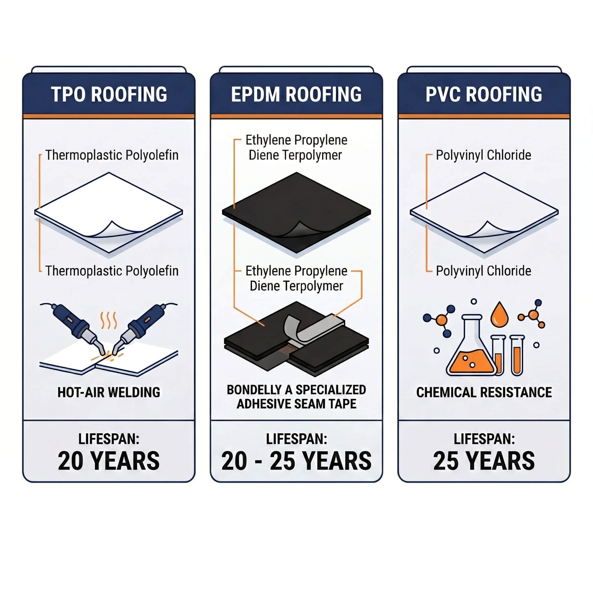Membrane choice matters less than installation quality. The same TPO that lasts 20 years on a careful install will fail in 8 years on a sloppy one. Look for: